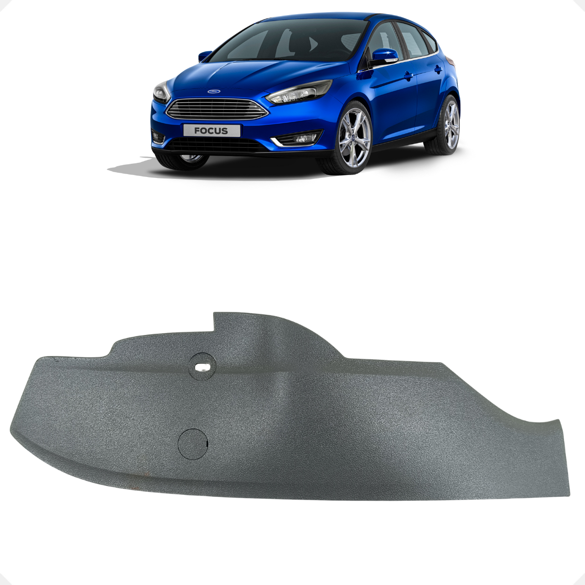Moldura de acabamento lateral da base do banco original Ford para o Focus (Geração 2). Esta peça reveste os mecanismos de ajuste e trilhos do assento do motorista, garantindo a proteção contra sujeira e a estética do habitáculo. Fabricada com o polímero de alta densidade característico da Ford, oferece resistência a impactos e encaixe firme, sem folgas.