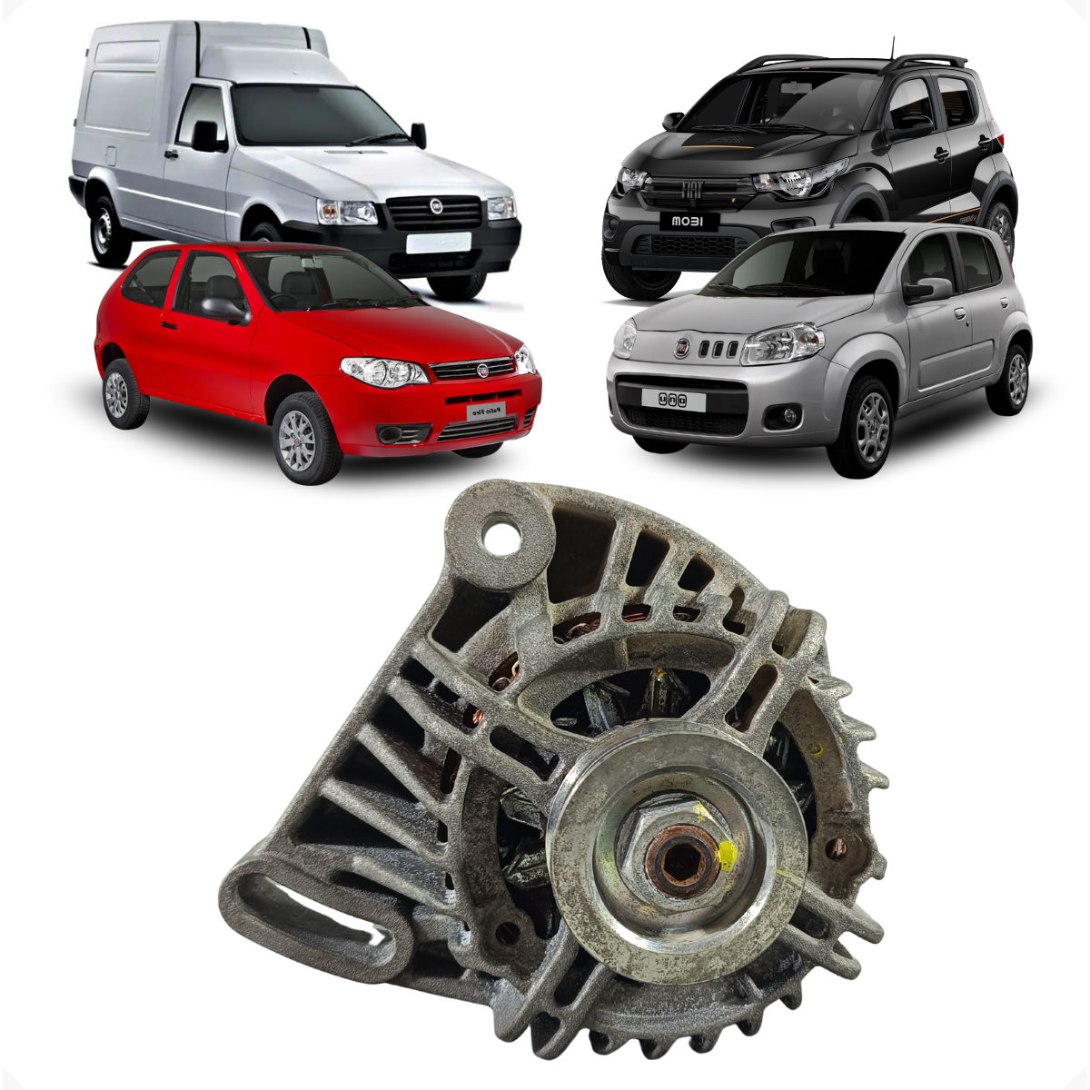 Alternador original Fiat, utilizado no sistema elétrico para recarga da bateria e alimentação dos componentes eletrônicos.