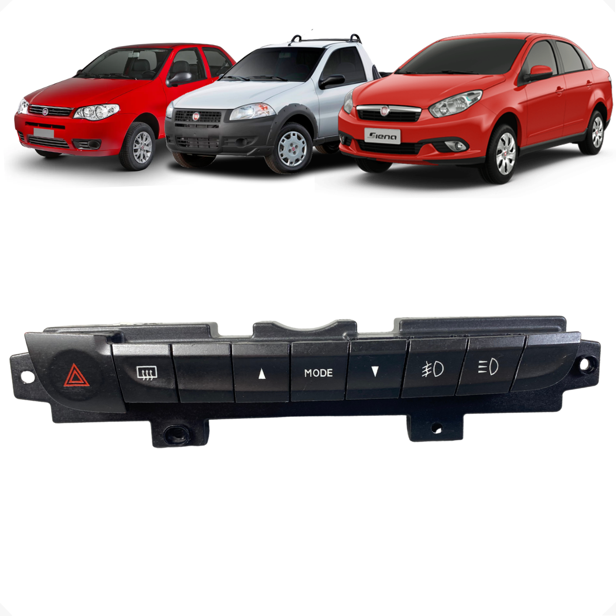 Botão de alerta e desembaçador compatível com Fiat Strada, Palio, Siena e Idea 2012–2013. Peça de reposição com encaixe direto no painel, concebida para substituição simples e segura, preservando a estética e a ergonomia do veículo. Ideal para restabelecer as funções do pisca-alerta e do desembaçador do vidro traseiro, garantindo visibilidade e segurança ao dirigir em condições adversas.