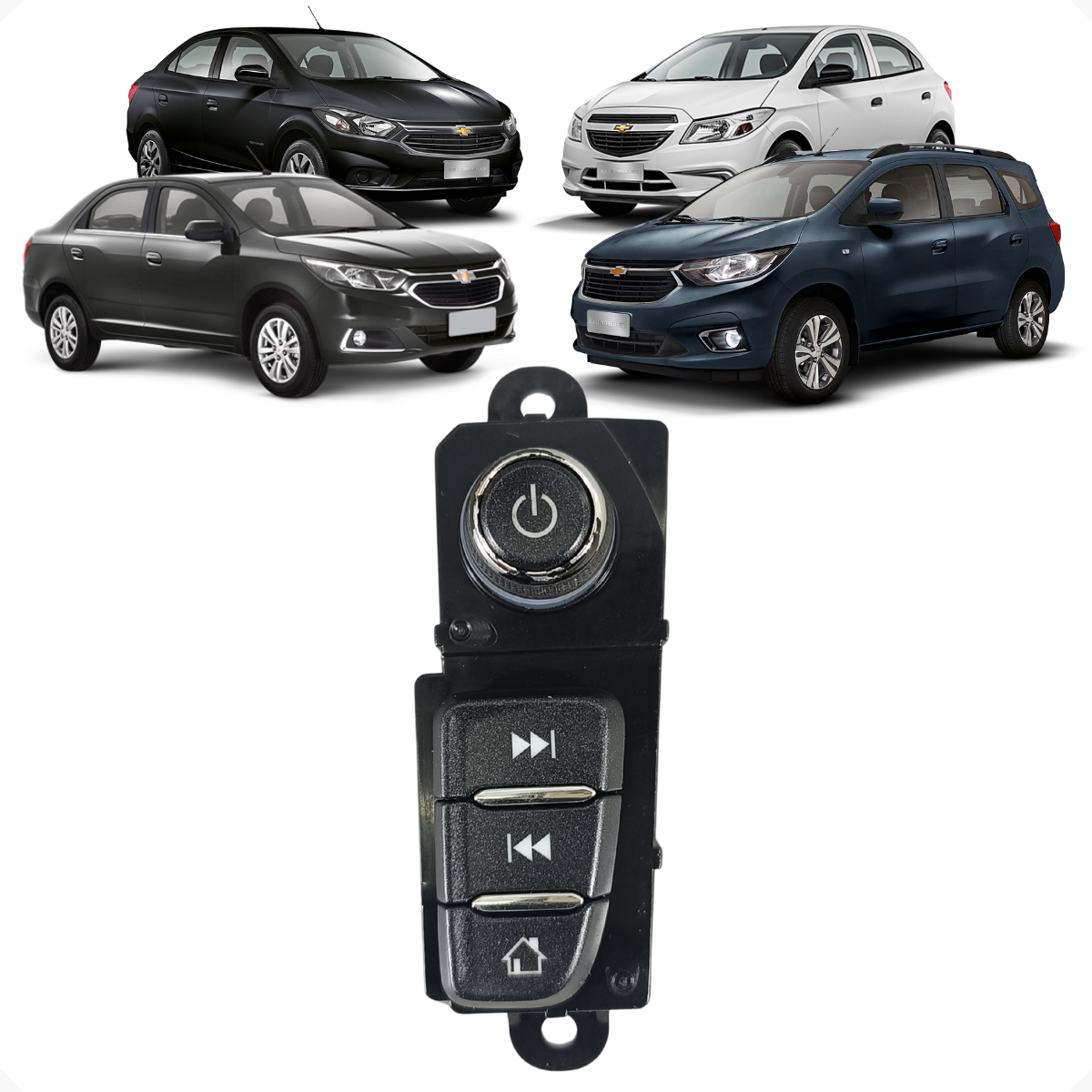 Botão de comando do sistema MyLink Chevrolet, utilizado para acionamento e controle das funções do multimídia conforme aplicação do veículo.