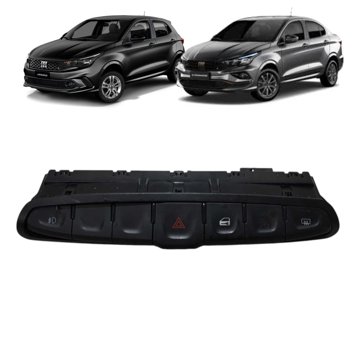 Botão comando multifuncional original Fiat, compatível com Fiat Argo e Cronos (anos 2018–2023). Substitua o interruptor do painel por peça testada e em perfeito funcionamento que reúne as funções de farol de milha, pisca-alerta, trava das portas e desembaçador traseiro em um único módulo plug-and-play. Produto com conector de 9 pinos, encaixe e acabamento idênticos às peças originais, garantindo instalação rápida sem adaptações elétricas.