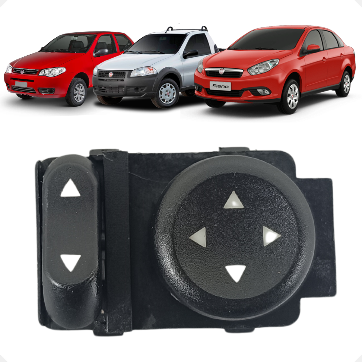 Joystick de comando dos retrovisores elétricos original Fiat. Este botão permite o ajuste milimétrico dos espelhos externos, oferecendo maior segurança e ergonomia ao motorista. Com o design consagrado da linha Palio, possui seletor de lado (L/R) e direcionador multidirecional, fabricado com contatos internos de alta sensibilidade para uma resposta imediata aos comandos.