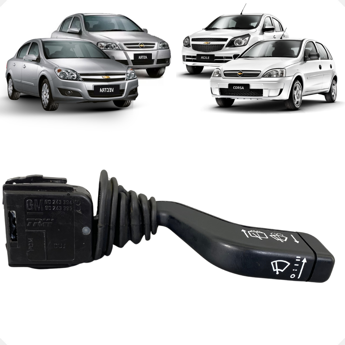 Chave de limpador (interruptor do limpador) compatível com veículos GM — aplicação ampla para Corsa, Astra, Omega, Vectra, Montana, Suprema e Agile. Peça original de reposição com referência Part Number 90243394 e NCM 85365090, testada e em perfeito funcionamento.