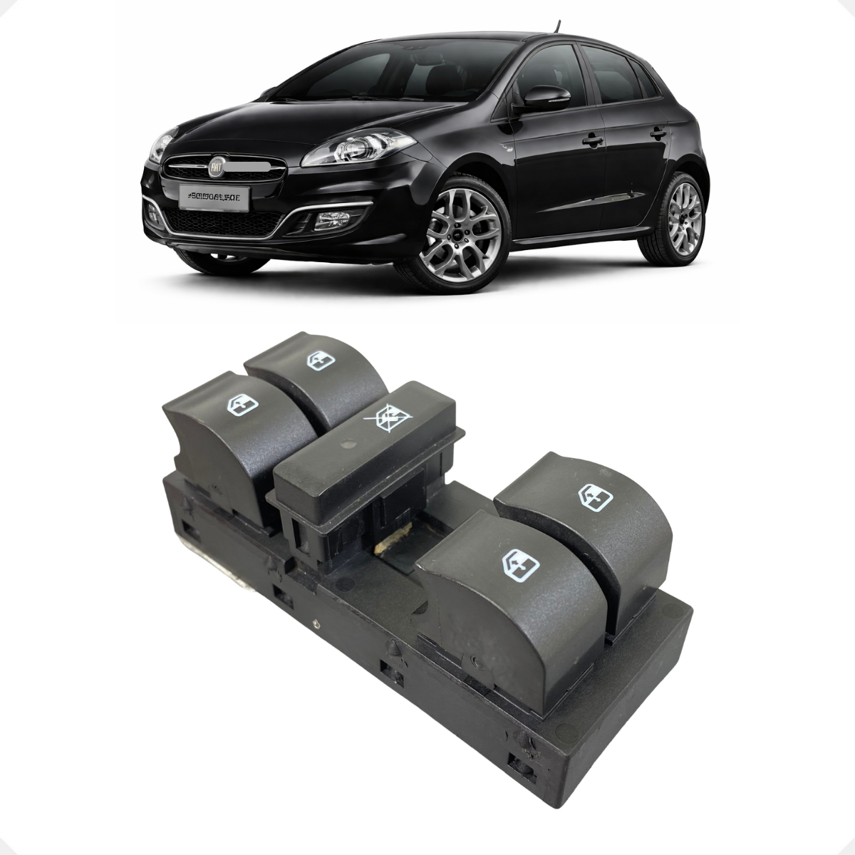 Comando de botão para vidro elétrico dianteiro esquerdo compatível com Fiat Bravo (modelos 2012–2013), Part Number 5179306D, NCM 85365090. Peça de reposição nova, testada eletricamente e destinada à substituição direta do comando original, sem necessidade de adaptações. Fabricada com materiais de qualidade, oferece acionamento suave, resposta rápida aos comandos e maior durabilidade para uso diário.