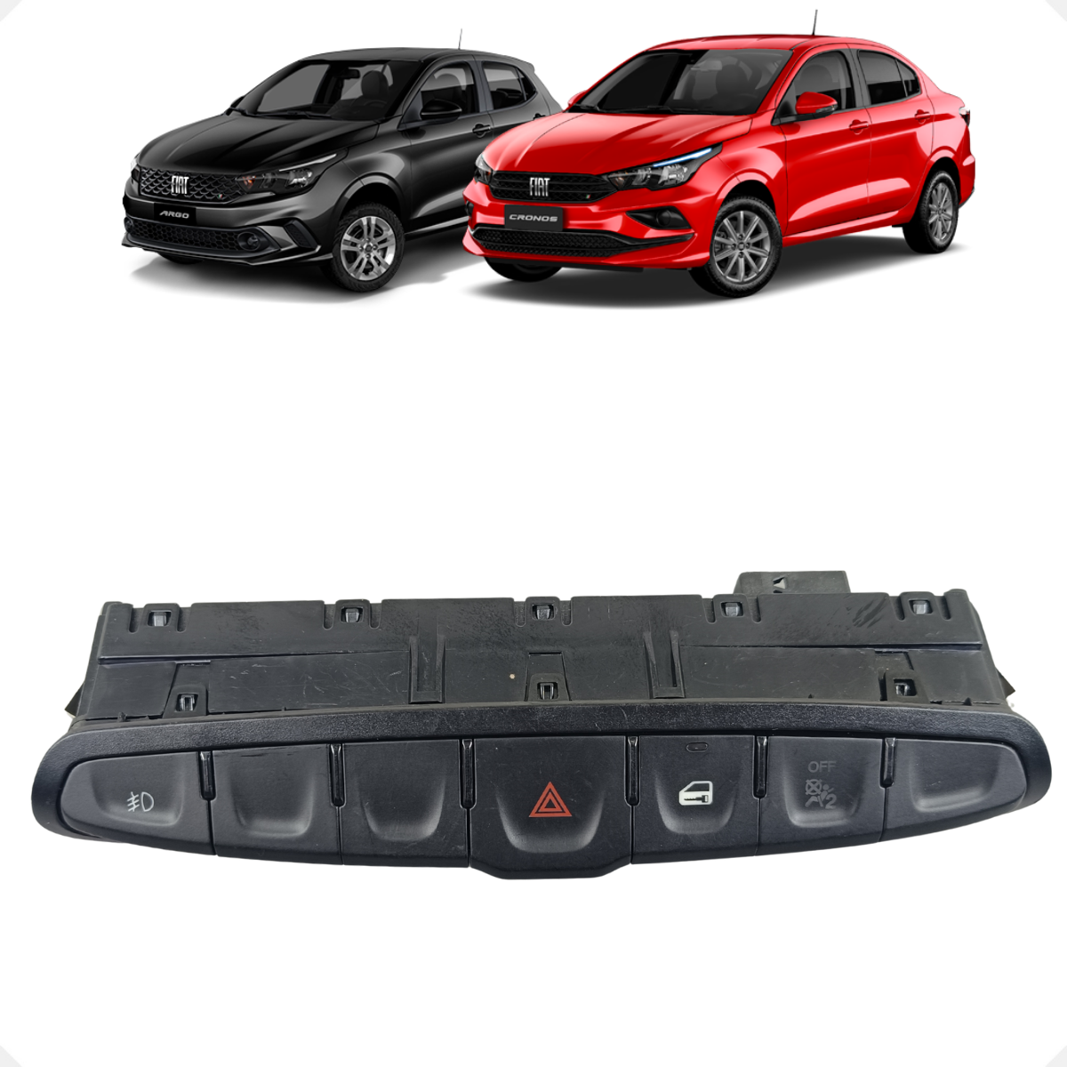 Módulo de comando central original Fiat para as versões mais completas do Argo e Cronos. Este conjunto de botões tipo "piano" integra as funções de pisca-alerta, travamento central das portas e o acionamento dos faróis de milha (neblina). Fabricado com tecnologia de membrana de alta durabilidade, oferece um toque preciso e iluminação em LED, mantendo a sofisticação e a funcionalidade total do painel do seu Fiat.