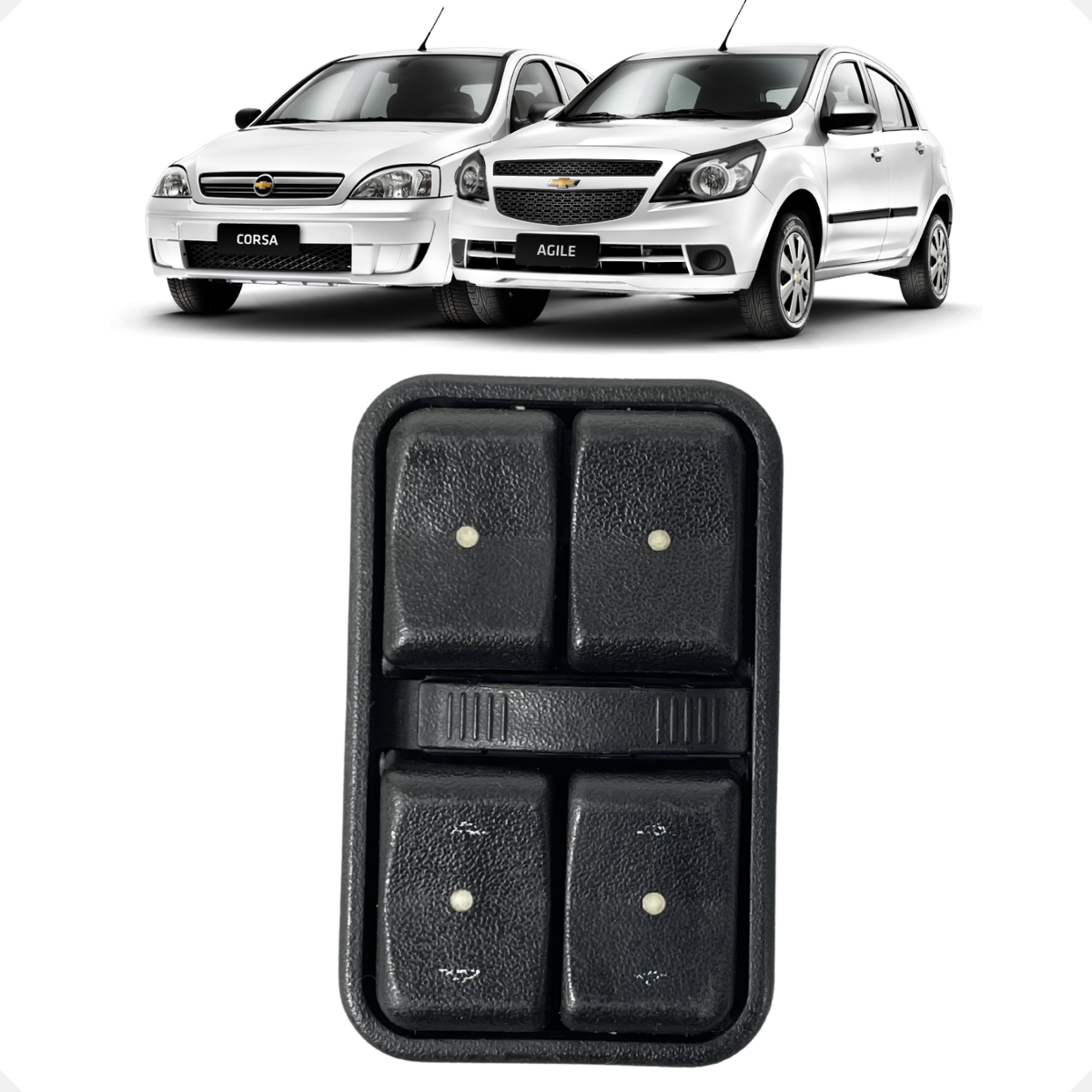 Interruptor duplo de comando dos vidros elétricos originais Chevrolet. Este comando permite ao motorista controlar os dois vidros dianteiros com facilidade e segurança. Projetado com o design ergonômico da linha Agile e Celta/Corsa G2, oferece acionamento suave e longa durabilidade. É a peça de reposição perfeita para quem busca restaurar a funcionalidade original com o encaixe e a iluminação padrão de fábrica.