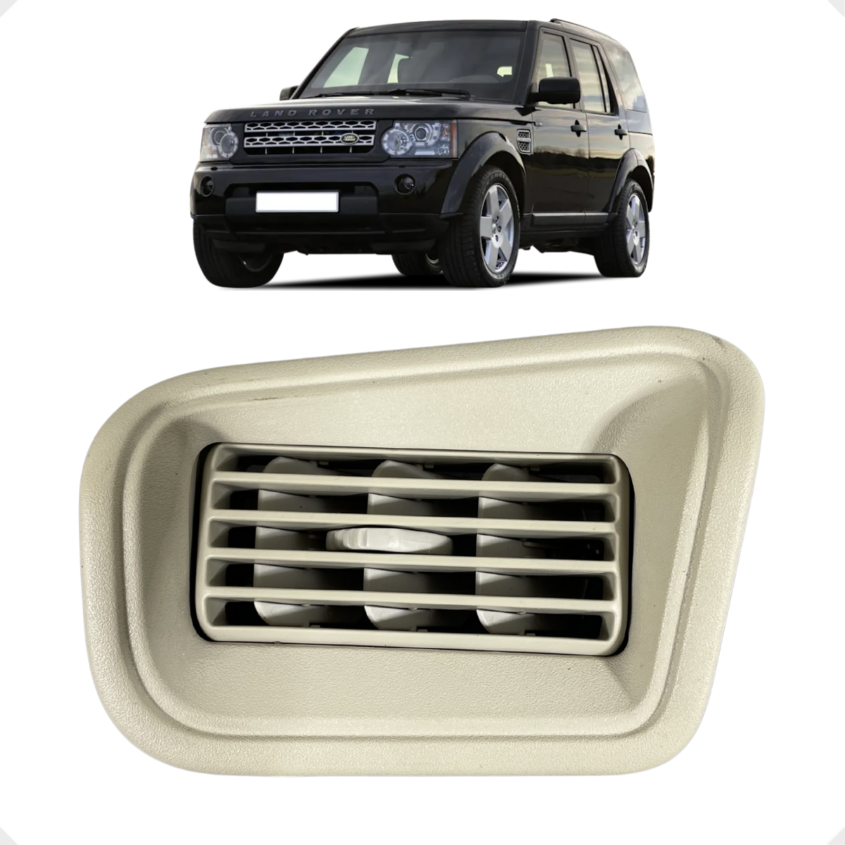Difusor de saída de ar da coluna traseira ("Coluna C") original Land Rover. Este componente é parte integrante do sistema de ventilação e climatização traseira, permitindo o direcionamento do fluxo de ar para os passageiros da segunda e terceira fileiras de bancos. Fabricado com o acabamento premium da linha Discovery, possui aletas ajustáveis que garantem o controle preciso da ventilação, mantendo o conforto térmico em todo o habitáculo do veículo.