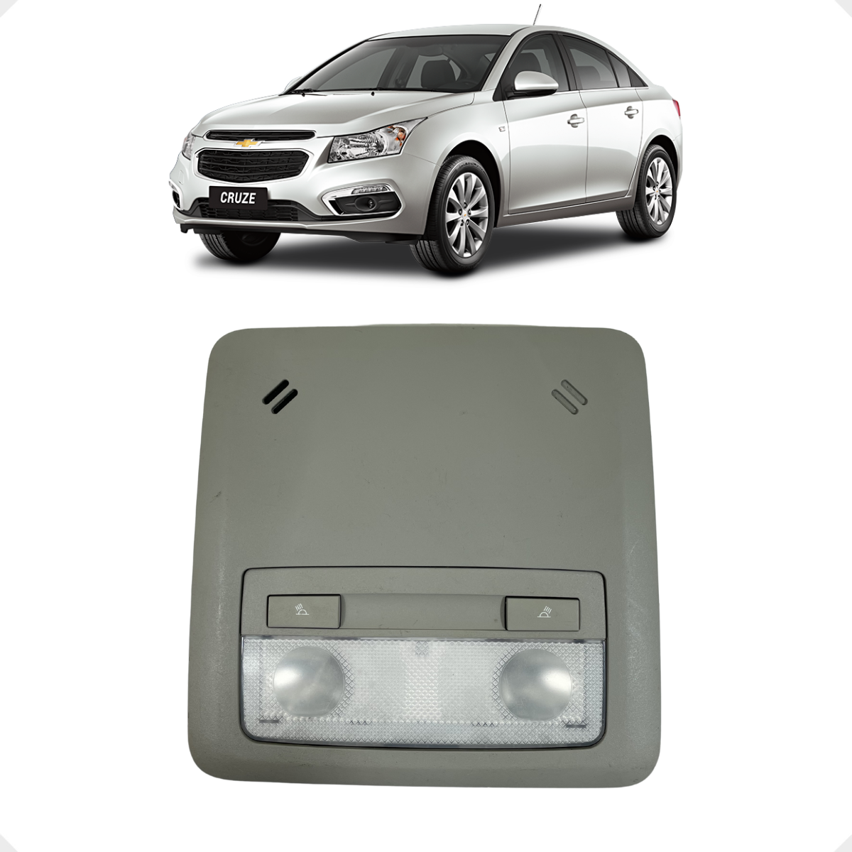 Console de iluminação interna original para o Chevrolet Cruze (Sedan e Sport6). Esta peça premium conta com luzes de leitura independentes e acabamento refinado, condizente com a categoria do veículo. Projetada com lentes de foco direcionado, permite o uso individual pelos ocupantes sem ofuscar a visão do motorista, mantendo o padrão de luxo e funcionalidade da linha Cruze.