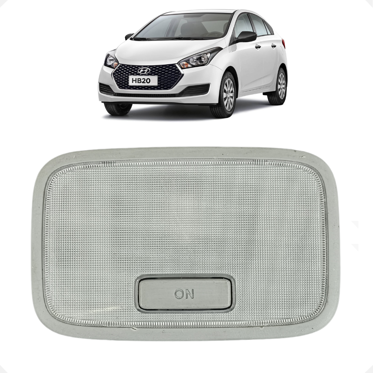 Luminária de teto interna traseira original Hyundai. Este componente proporciona a iluminação de cortesia para os passageiros do banco traseiro, facilitando o embarque e desembarque noturno. Com lente translúcida que otimiza a dispersão da luz e interruptor integrado de três posições (On/Off/Door), mantém o padrão de conforto e conveniência original da linha HB20.