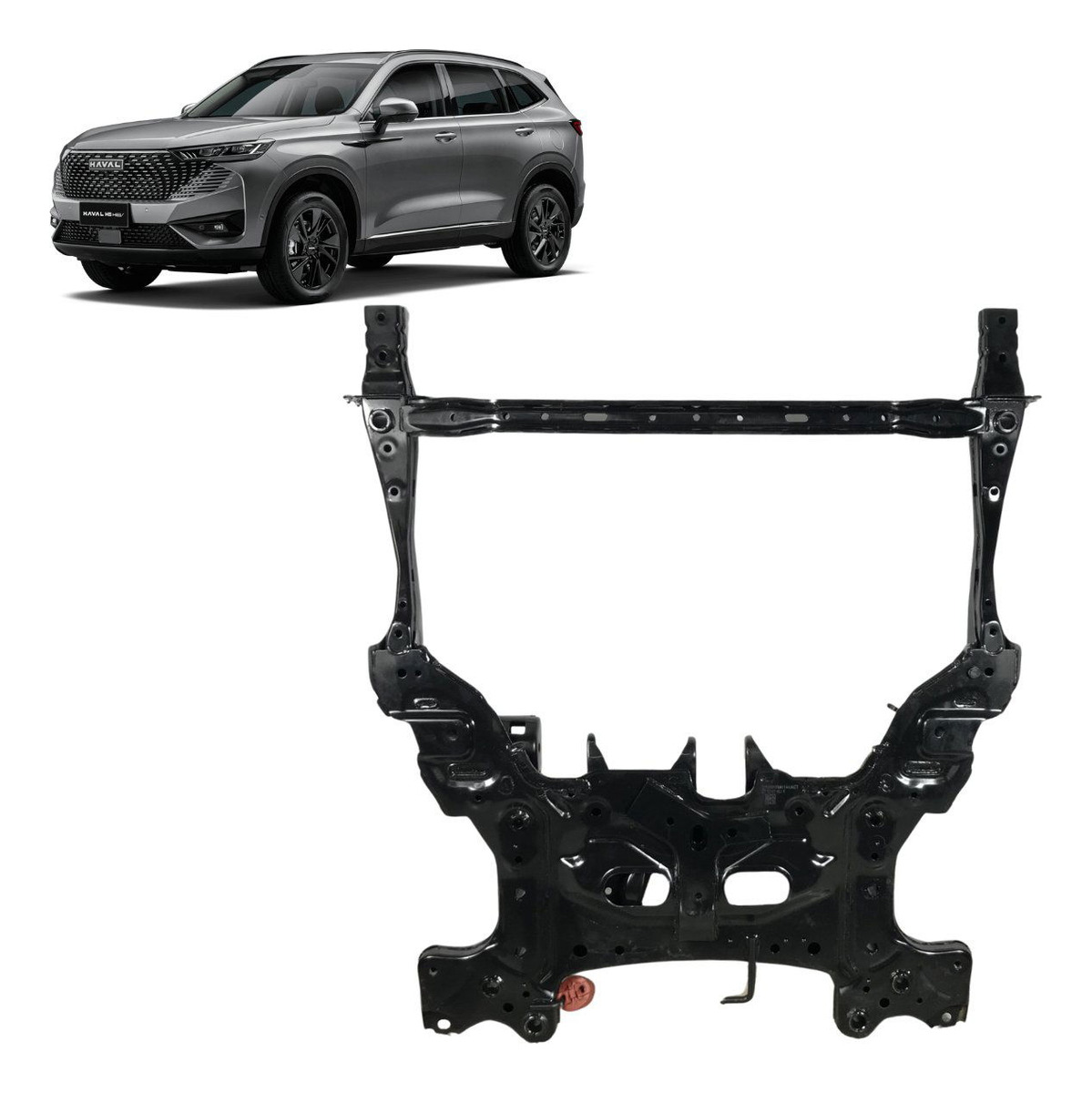 Quadro de agregado dianteiro (subchassi) original GWM Haval H6. Esta é a peça estrutural central da suspensão dianteira, responsável por sustentar o motor, o sistema de direção e as bandejas de suspensão. Fabricado com engenharia de alta resistência, garante o alinhamento geométrico do veículo e a absorção de impactos e vibrações, mantendo a integridade estrutural da plataforma.