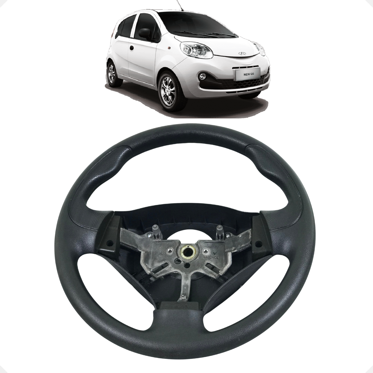 Volante de direção original para o Chery New QQ. Projetado para oferecer ergonomia e segurança na condução, este volante possui empunhadura confortável e estrutura reforçada. Fabricado com materiais que atendem aos padrões de segurança automotiva, ele permite o acionamento preciso da buzina e mantém a integração visual moderna do interior do compacto da Chery.